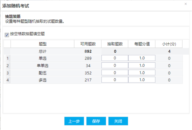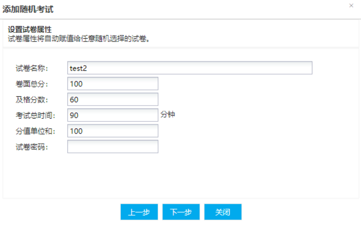 第四种随机方式:自定义题型题量为每个考生出题,填写随机试卷的相关属性,以及设置题型体量,截图说明: