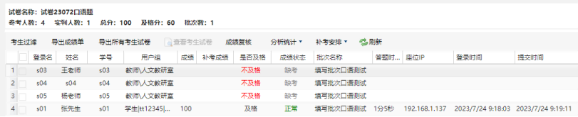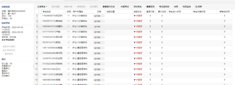 安排完考试后,当考试进行时可以实时的对本场考试的考生答题状态进行监控以及相关操作: