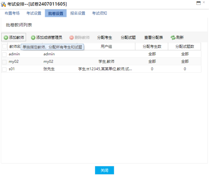 在考试安排界面,选择试卷,点击批卷设置,可以指定阅卷教师,指定各部门成绩查询专员。